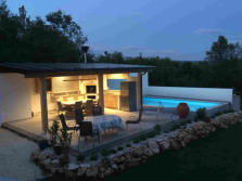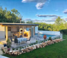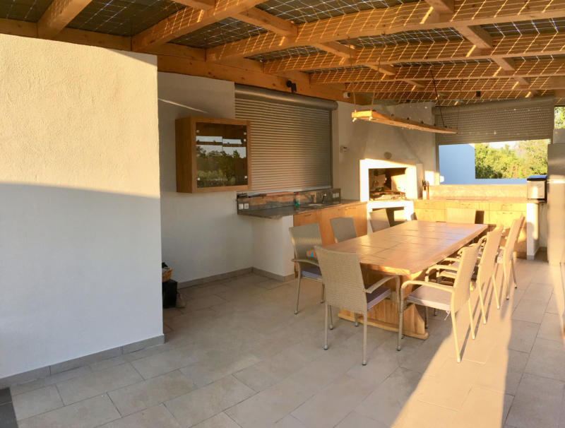 FREIBEREICH “ Vila lagana Bura " Pool, Sommerküche und Aussenbereich. Auf ca. 100 m² stehen eine bestens ausgestattete Sommerküche mit Geschirrspüler, Spüle, Kühl / Gefrierschrank und einem Induktionskochfeld zur Verfügung. Ein offenem Kamin mit Grill - möglichkeit garantiert bei jeder Witterung eine Grillparty im Freien. Der großzügige Essbereich mit einer Sitzmöglickeit für 8 bis 10 Personen ist durch eine Pergola komplett beschattet und sorgt mit einer Photovoltaikanlage für einen ökologischen Betrieb der gesamten Anlage mit Pool, Außenbereich und dem Wohnhaus.Der Außenbereich verfügt auch selbstverständlich über eine eigene Dusche und W.C.Etwas abseits, steht ein schattiger Platz für den Sundowner zur Verfügung.